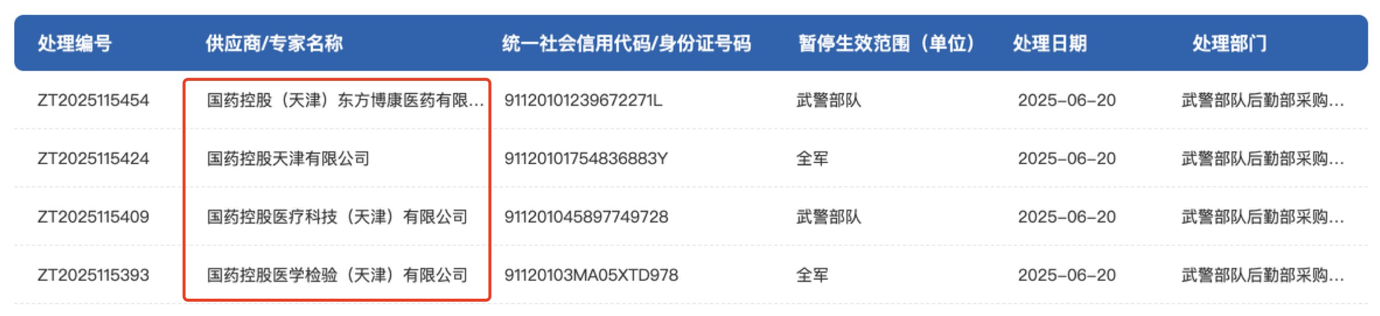 近日,军队采购网发布暂停处理公告,国药集团旗下多家子公司被暂停物资工程采购活动资格,暂停事由皆为存在围标串标的违法违规行为。