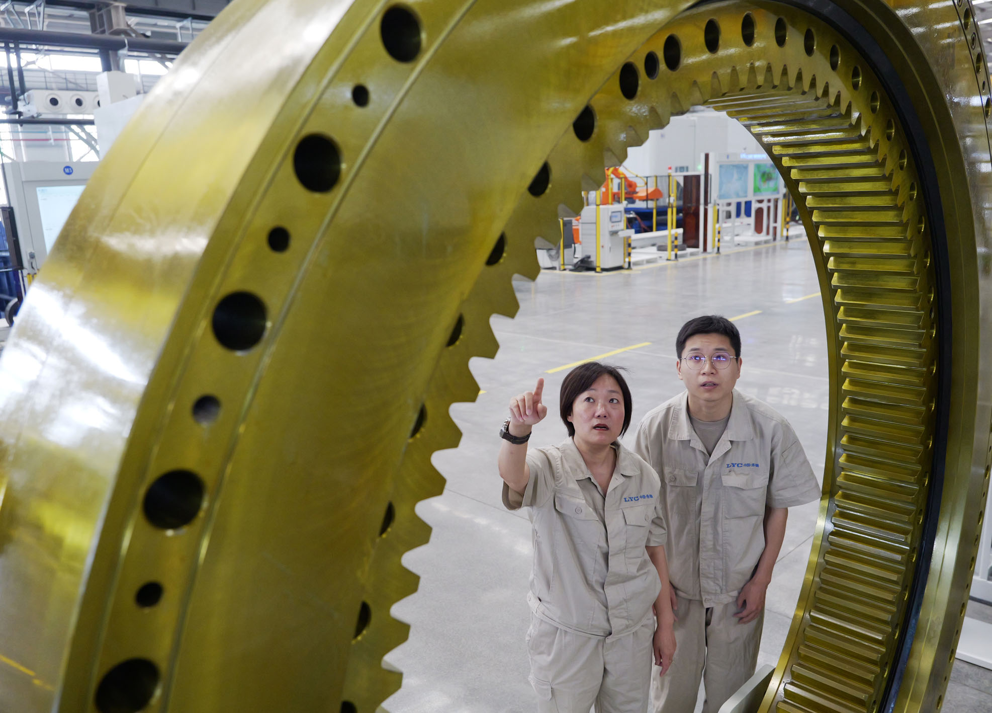 洛轴集团技术中心高端轴承项目研发团队成员在讨论盾构机轴承的数据参数。新华社记者 李嘉南 摄
