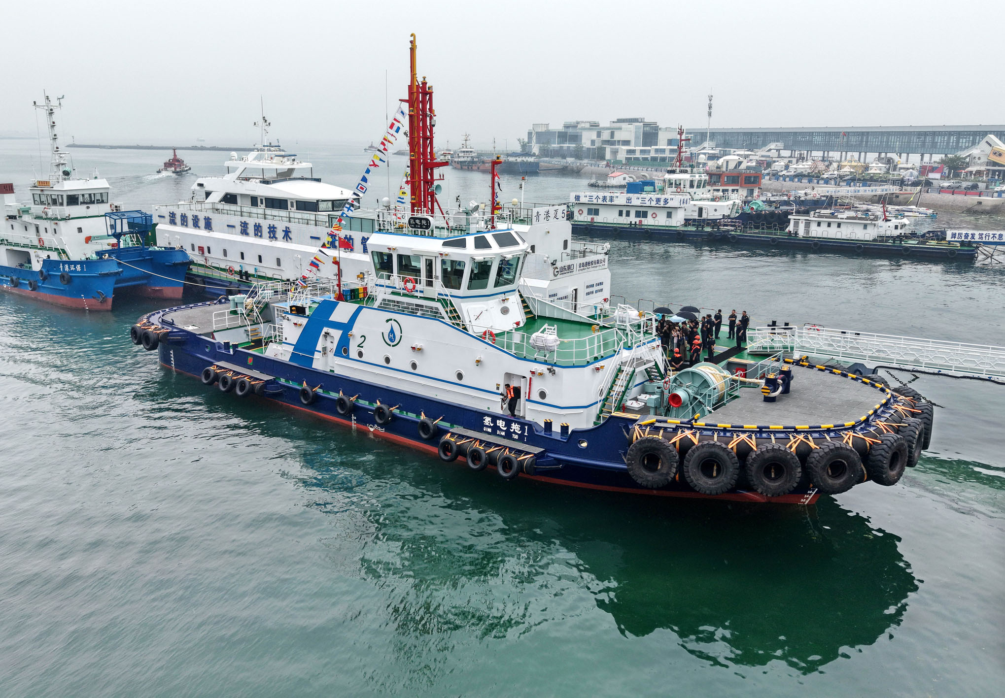 “氢电拖1”轮靠泊在山东港口青岛港码头(无人机照片,6月26日摄)。6月26日,国内首艘氢电拖轮——“氢电拖1”轮在山东港口青岛港入列。该拖轮搭载“氢燃料电池+液冷锂电池”混动系统,可实现零碳排放。据介绍,与传统燃油拖轮相比,“氢电拖1”轮在噪音控制、设备寿命、能源利用效率等方面优势显著。该轮投产后,预计每年可减少二氧化碳排放1500余吨。