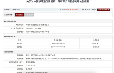 公告显示,经调查,中国移动通信集团设计院有限公司在参加项目编号:2023-JQ-FC105(00)-物流-0124473采购活动中,涉嫌存在违规失信行为。根据军队供应商管理相关规定,自2025年6月29日起暂停其参加联勤保障部队范围物资工程服务采购活动资格。在暂停期内,法定代表人孙卫东控股或管理的其他企业暂停参加上述范围军队采购活动,授权代表胡传新暂停代理其他供应商参加上述范围军队采购活动。