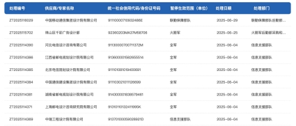 6月4日,军采网发布多则公告,对包括江西省邮电规划设计院有限公司、北京电信规划设计院有限公司、湖南省邮电规划设计院有限公司、河北电信设计咨询有限公司(前身为河北省电信设计研究院)以及中国通信建设集团设计院有限公司在内的多家通信设计单位作出暂停全军范围采购资格的处理决定。