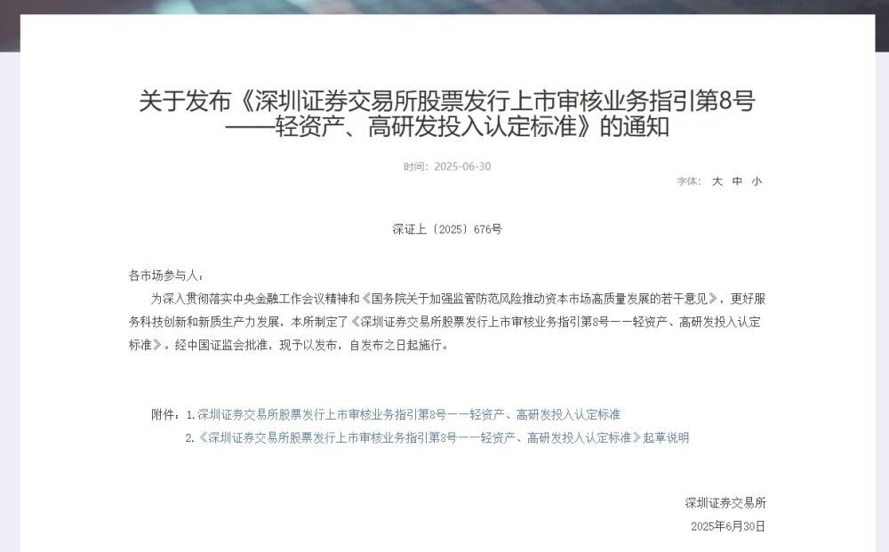 6月30日,深交所发布《深圳证券交易所股票发行上市审核业务指引第8号——轻资产、高研发投入认定标准》(以下简称《指引》),自发布之日起施行。