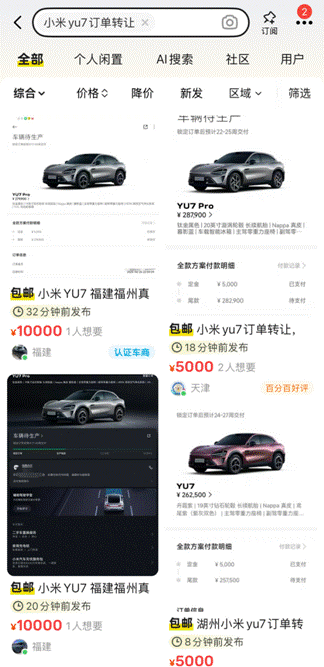 小米YU7订单交付的长周期也催生了订单转让的“黄牛”生意。《经济参考报》记者发现,在某二手商品交易平台,有消费者在溢价出售自己的汽车订单。