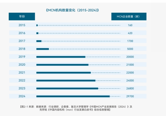 报告显示,过去十年MCN行业经历了高速发展,机构总量从2015年的160家增至2024年的2.9万家。