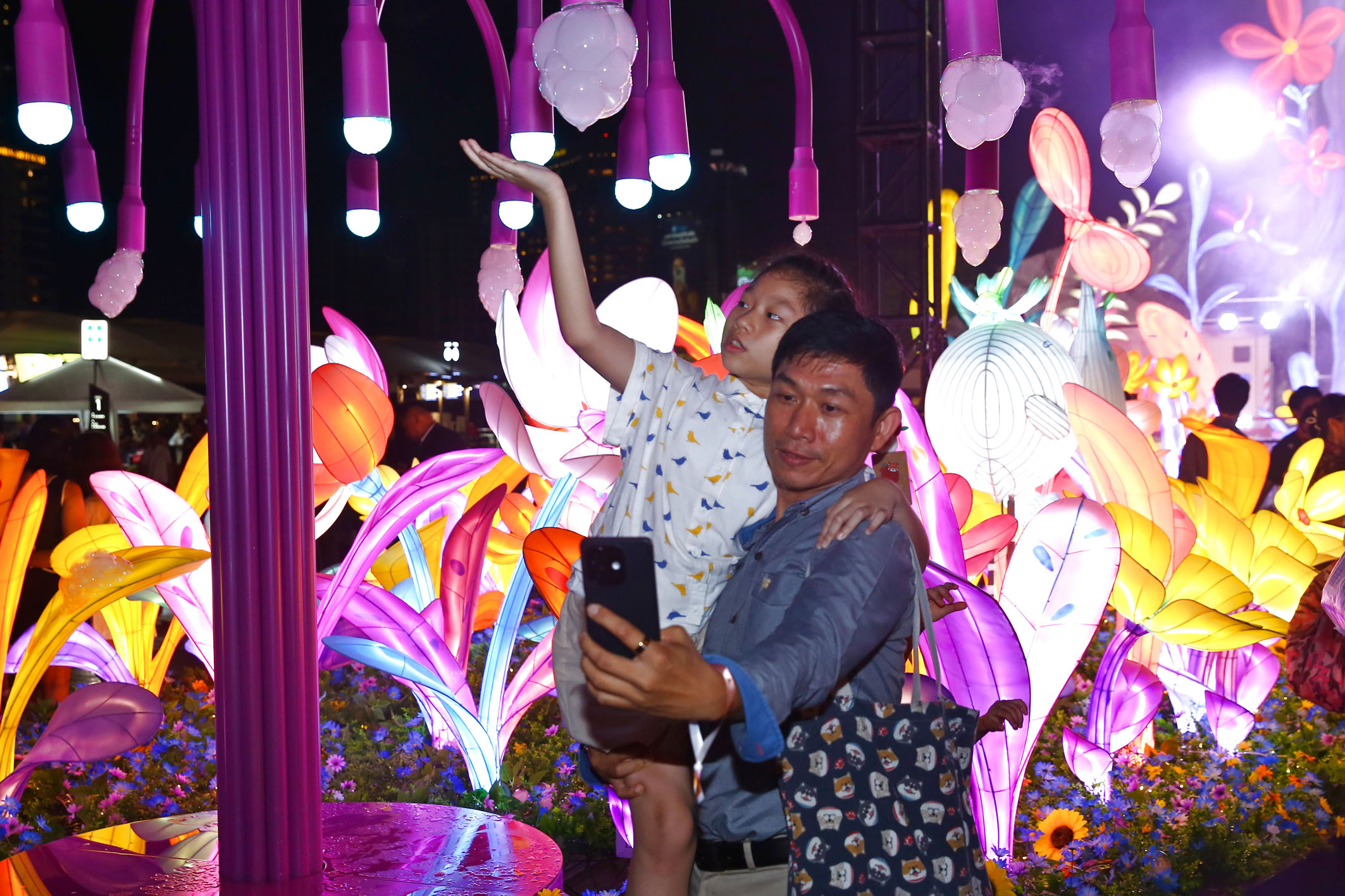 近日,在泰国曼谷商业地标暹罗天地,游客在灯会上拍照。