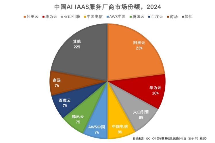根据IDC报告,2024年全年,阿里云AI IaaS市场份额达23%,华为云占比10%,火山引擎占比9%。IDC认为,生成式IaaS市场持续快速迭代,头部格局加速收敛:目前,阿里云依托云资源规模优势和PAI及灵骏产品能力,在大模型训练及大模型推理IaaS市场,均位列第一。IDC预计头部公司将继续加大算力投入规模以提升模型通用性能,形成技术和生态主导权。