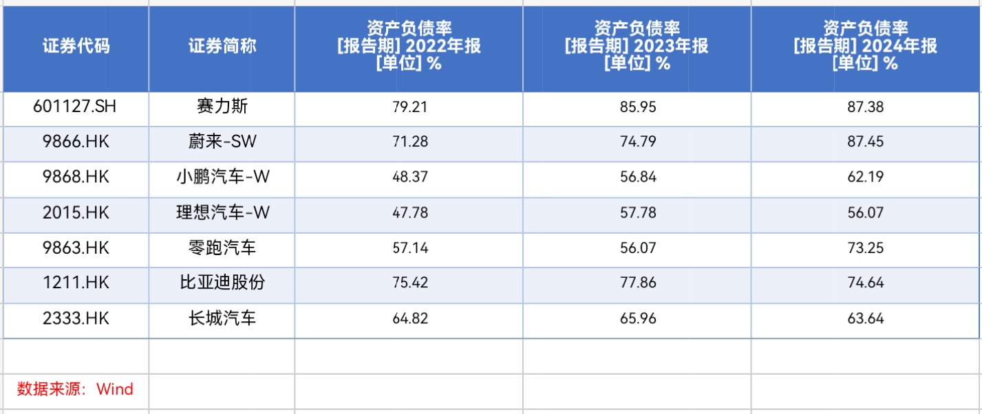 Wind数据显示,2022年至2024年,赛力斯资产负债率分别为79.16%、85.95%、87.38%,高于小鹏汽车、理想汽车、零跑汽车等造车新势力同期水平。今年一季度末,赛力斯资产负债率虽然降至76.83%,但仍处高位。