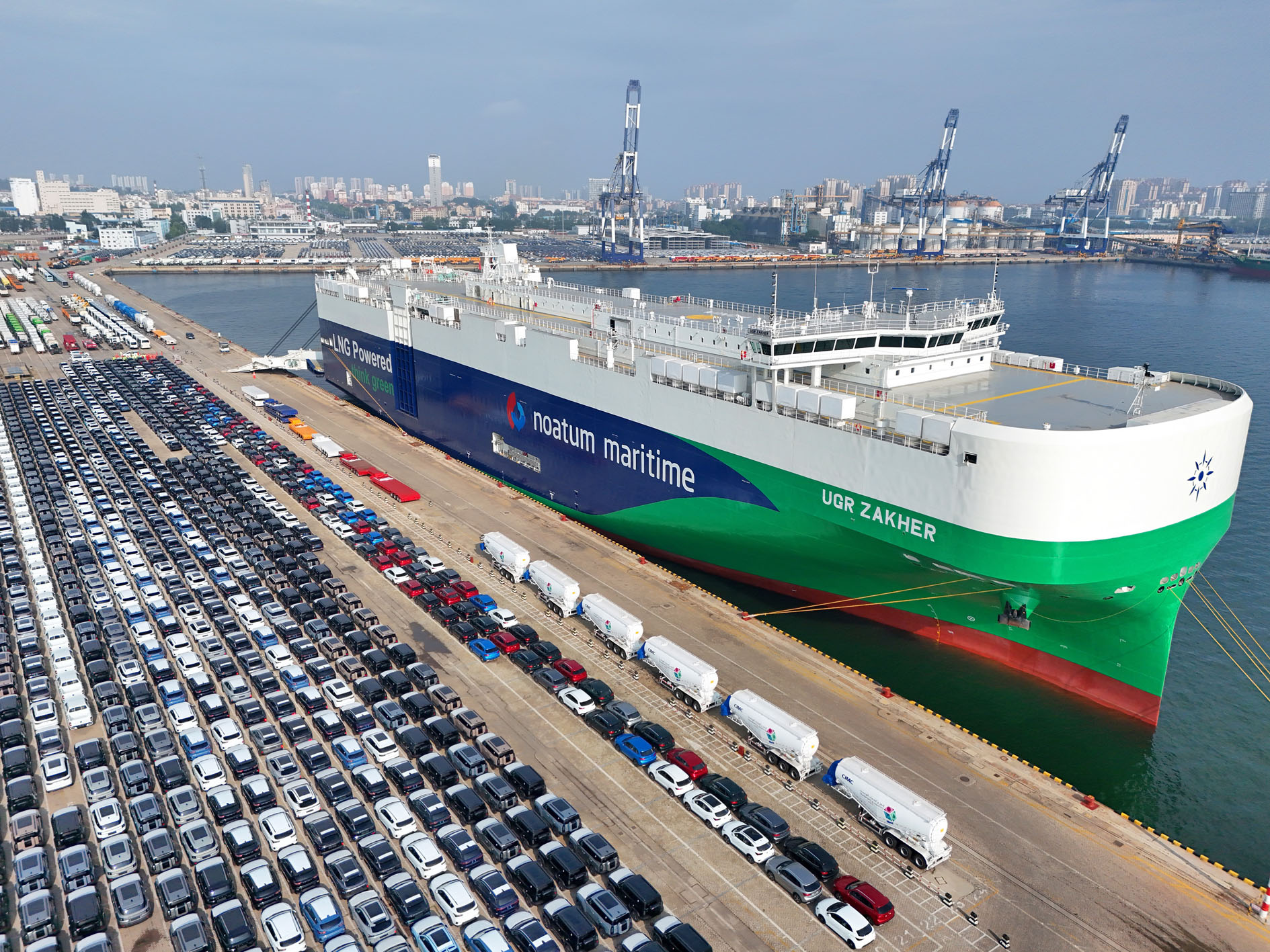 图为近日拍摄的汽车运输船在山东港口烟台港装运出口汽车(无人机照片)。 新华社发(唐克 摄)