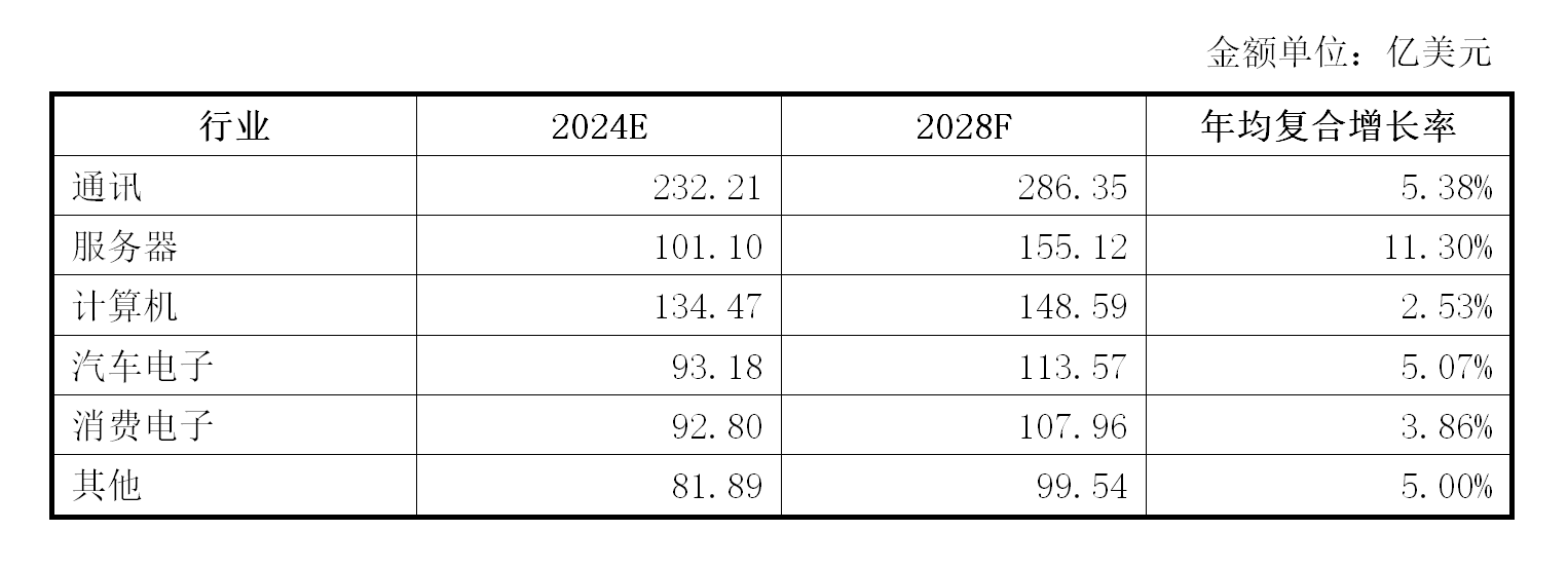 从细分市场来看,随着大数据、云计算、5G通信等新一代信息技术的发展,对数据存储和计算力的需求呈高增长态势,服务器行业发展空间广阔。随着新能源汽车的不断普及和汽车电动智能化程度的持续加深,汽车电子行业预计迎来高增长。根据Prismark的统计和预测,2024年的市场规模和2024年至2028年的预测年均复合增长率如下: