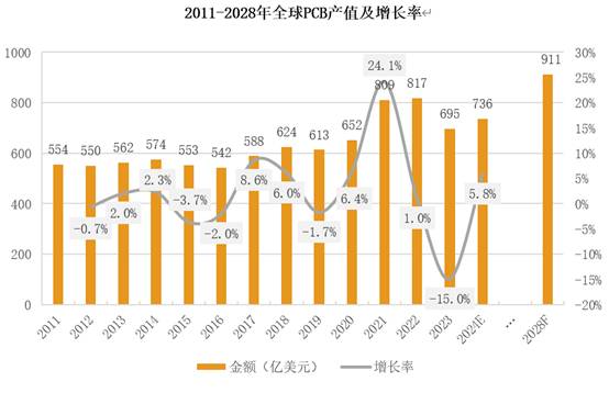 未来,新能源汽车、云计算等PCB下游应用行业预期将蓬勃发展,并带动PCB需求的持续增长。根据Prismark的预测,未来五年全球PCB市场将保持稳定增长,2024年至2028年复合年均增长率为5.5%。