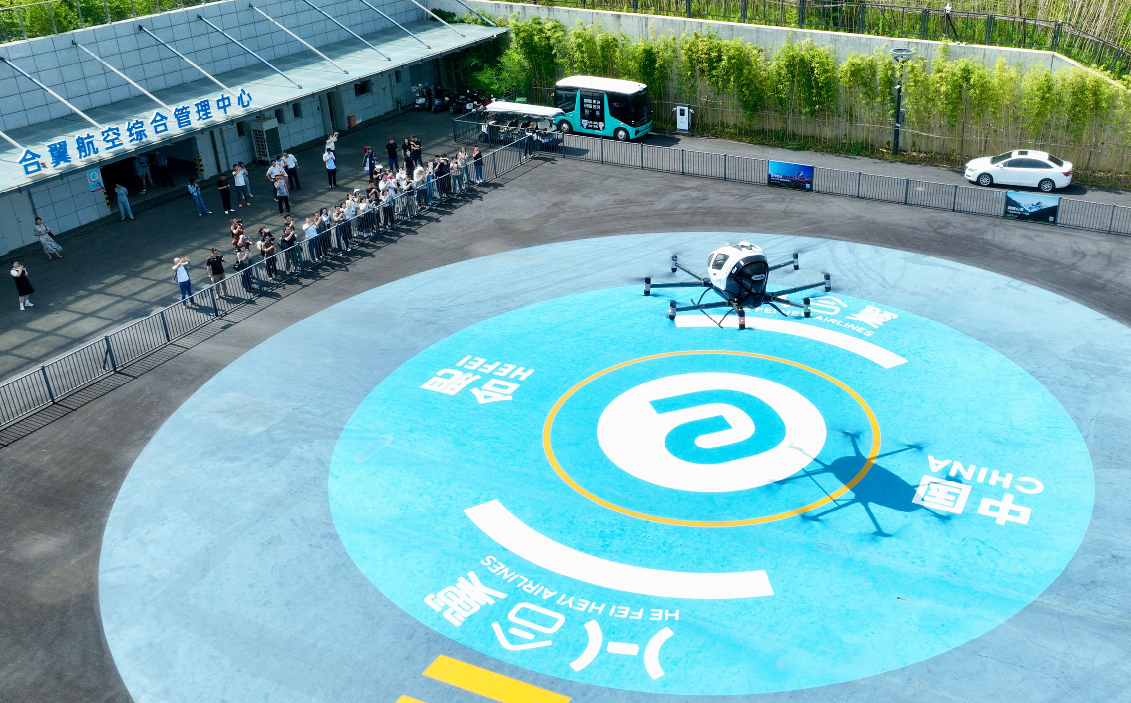 7月2日,一架电动垂直起降飞行器(eVTOL)在合肥骆岗公园演示飞行(无人机照片)。记者 周牧 摄