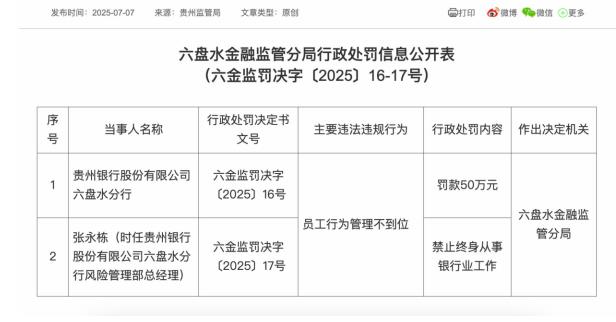 7月7日,六盘水金融监管分局披露行政处罚信息,贵州银行六盘水分行及相关责任人因 “员工行为管理不到位” 遭遇监管处罚。