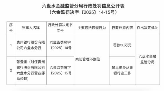 7月4日,六盘水金融监管分局行政处罚信息公开表显示:贵州银行股份有限公司六盘水分行,因“案防管理不到位”,被罚款50万元;同时,时任贵州银行股份有限公司六盘水分行营业部总经理张登奎被禁止终身从事银行业工作。