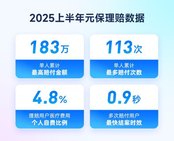 半年报显示,元保用户医疗总费用商保报销46.9%,自费比例仅占4.8%,单人累计最高赔付183万元,累计最多赔付113次。这背后是元保普惠保险产品提质扩面的成效,让用户享受到长期优质医疗服务,提升保险保障获得感。