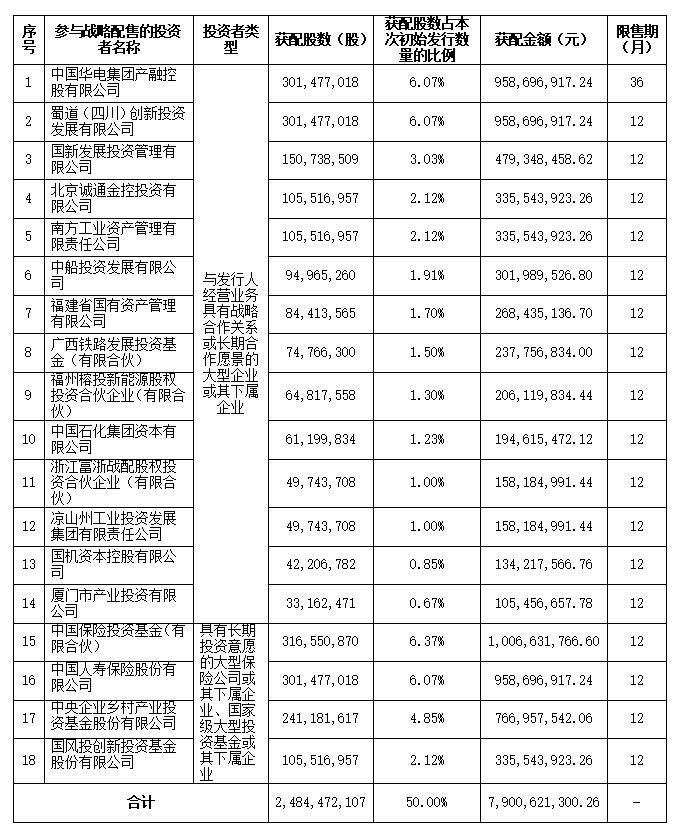华电新能本次发行的战略配售机构阵容强大、实力雄厚,反映出资本市场对优质项目的高度认可。本次参与华电新能战略配售的18家投资者主要分为两类,一类是与华电新能经营业务具有战略合作关系或长期合作愿景的大型企业或其下属企业,包括中国华电集团产融控股有限公司、蜀道(四川)创新投资发展有限公司、国新发展投资管理有限公司、北京诚通金控投资有限公司、南方工业资产管理有限责任公司、中船投资发展有限公司、福建省国有资产管理有限公司等14家;另一类是具有长期投资意愿的大型保险公司或其下属企业、国家级大型投资基金或其下属企业,包括中国人寿保险股份有限公司、中国保险投资基金(有限合伙)、中央企业乡村产业投资基金股份有限公司以及国风投创新投资基金股份有限公司等4家。此外,公告显示,本次发行初始战略配售发行数量为2,484,472,107股,占本次发行数量的50%(超额配售选择权行使前),约占超额配售选择权全额行使后发行总股数的43.48%。
