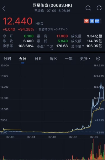 7月9日,周杰伦宣布入驻抖音平台,账号以其官方二次元IP形象“周同学”命名,头像也是“周同学”IP化身,认证身份为歌手。受该消息的提振,“周杰伦概念股”巨星传奇(6683.HK)收涨94.37%,收盘价为12.44港元,总市值106.95亿港元,单日成交量9.34亿股,成交额达114.85亿港元;盘中一度拉升涨165.62%,两日暴涨146.34%。