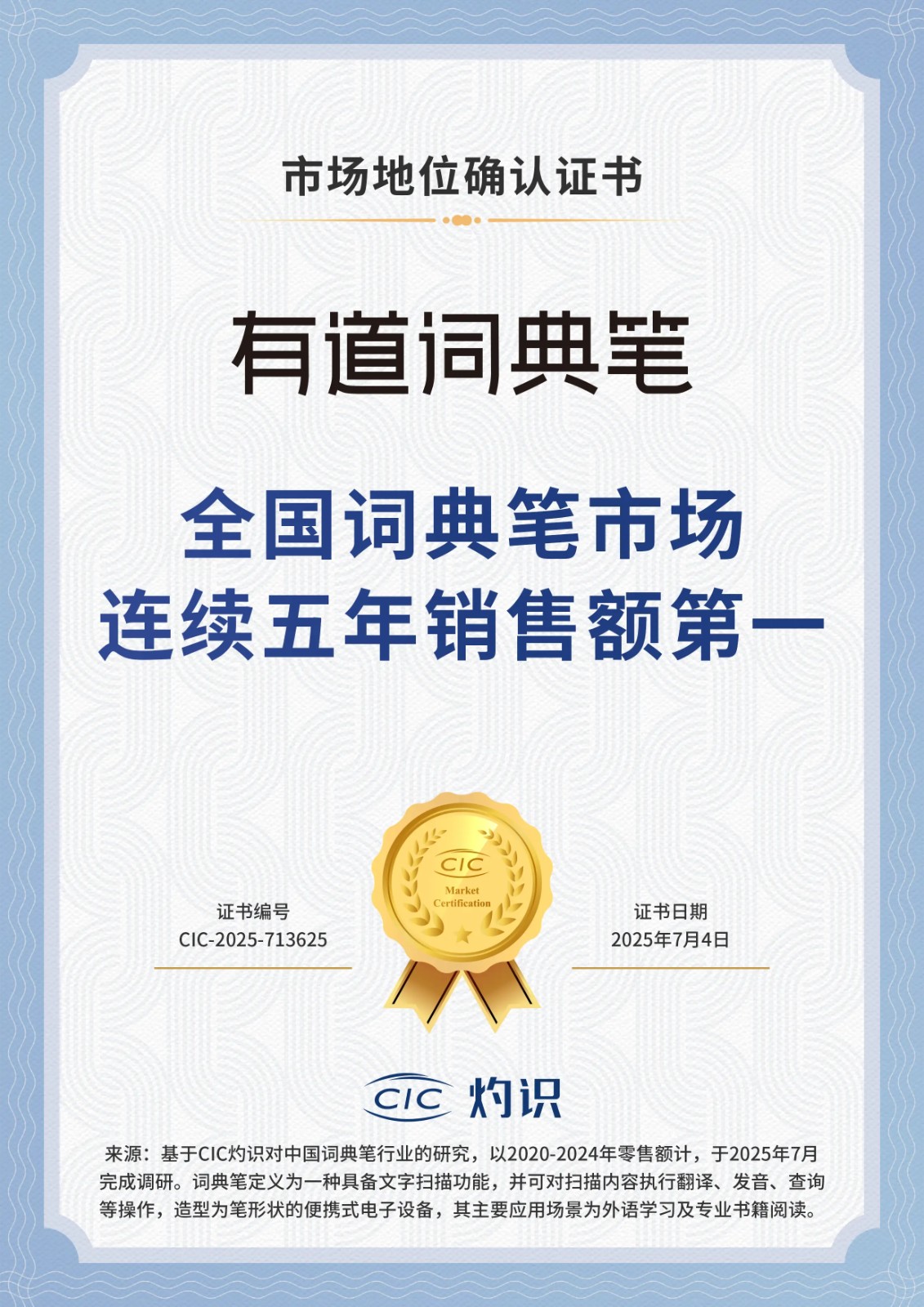 连续五年,全国第一!7月4日,有道词典笔获得由权威咨询机构CIC灼识授予的的“全国词典笔市场连续五年销售额第一”市场地位确认证书,行业领军的技术实力、一马当先的市场地位再次得到权威认定。