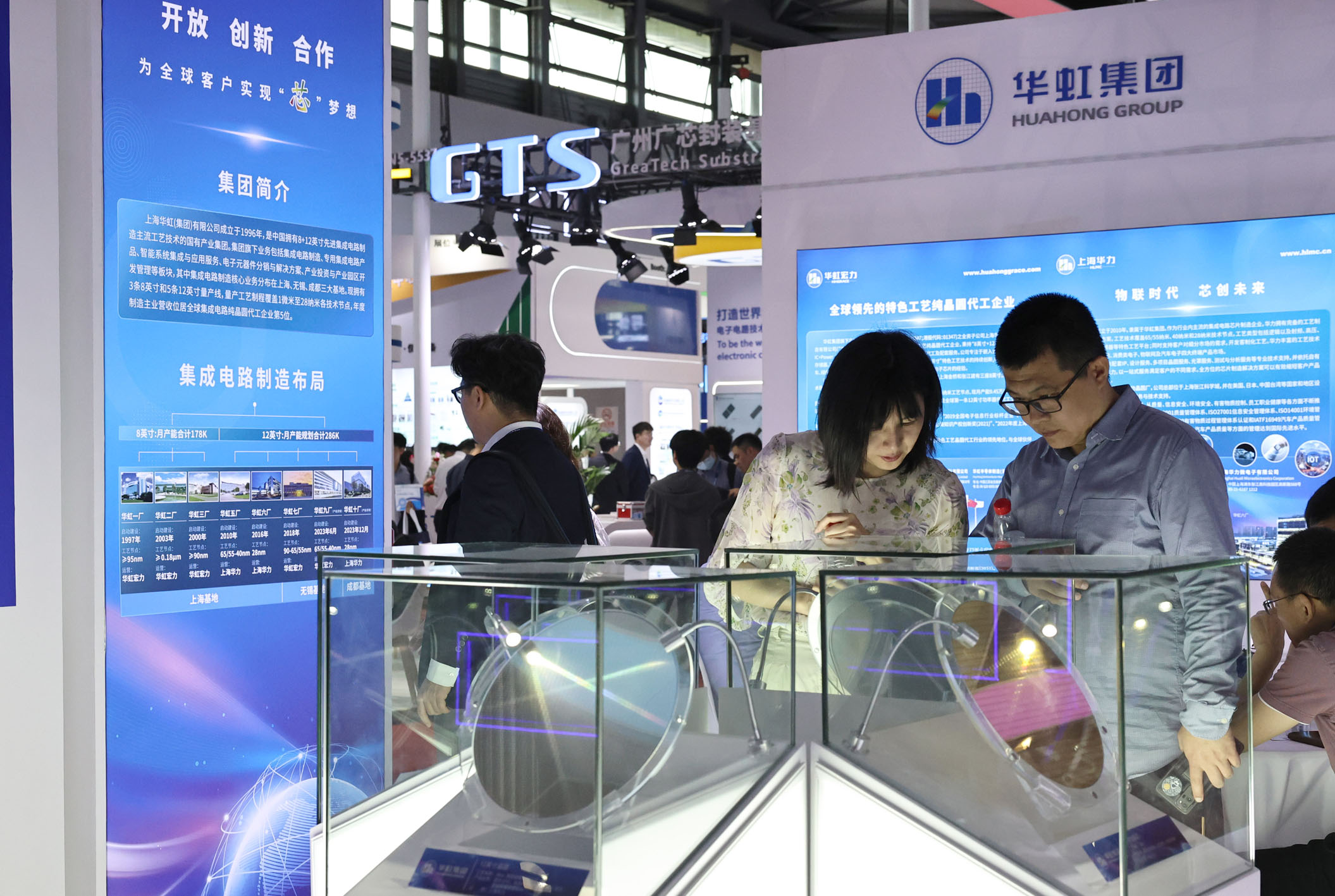 图为2025中国国际半导体展上,参观者在一组晶圆产品展柜前驻足观看。资料照片
