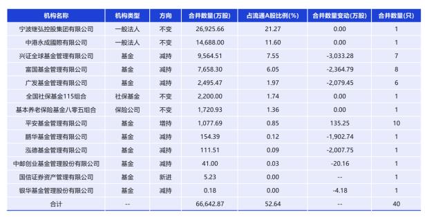 Wind数据显示,截至2025年一季度末,共有13家内地机构投资者持仓继峰股份,持股数量合计约6.66亿股,占流通A股比例为52.64%(如下图所示)。