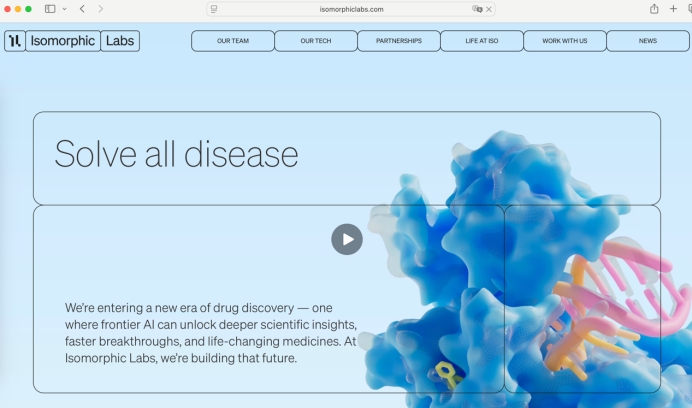 Isomorphic Labs是Alphabet集团旗下专注于人工智能药物研发的公司,成立于2021年。在该公司官网首页,非常醒目地宣扬“用AI解决所有疾病”作为其使命。该公司的核心优势在于利用“阿尔法折叠”(AlphaFold)技术平台进行蛋白质及生命分子结构预测,致力于加速药物发现进程。