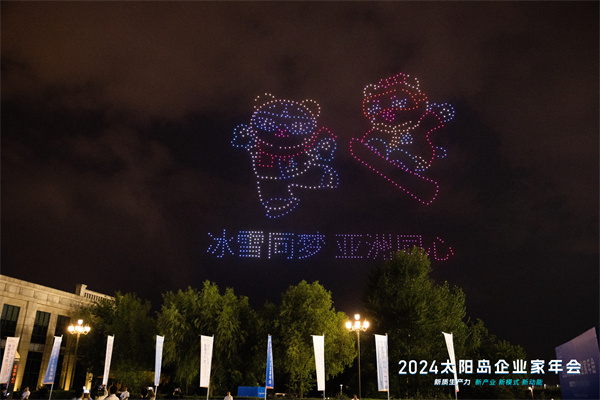 年会期间无人机编队表演在松花江畔的太阳岛上进行。