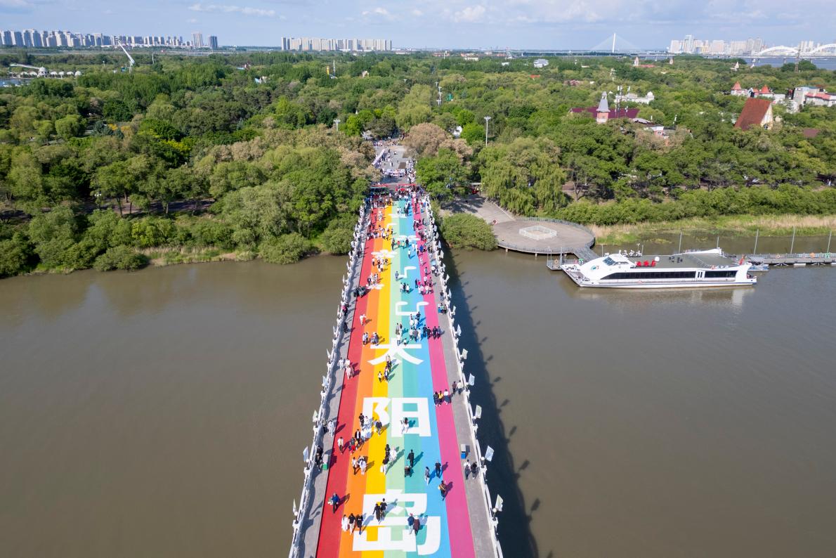 5月24日,游客在太阳岛风景区“阳光彩虹桥”游览。新华社记者张涛 摄