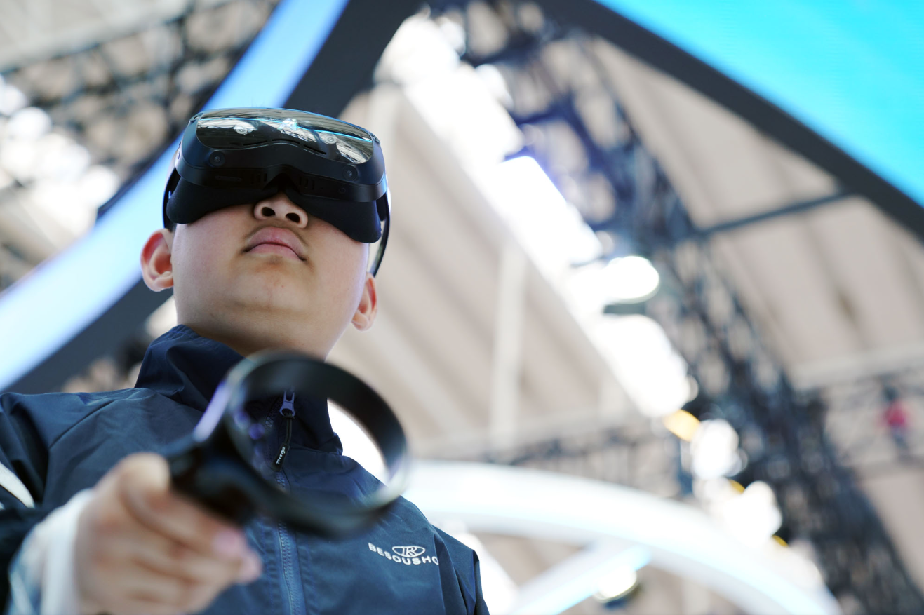 近日,一名小朋友在哈尔滨举办的第三十四届哈洽会主会场体验AI与VR技术结合的智能化眼镜。 新华社记者 王松 摄