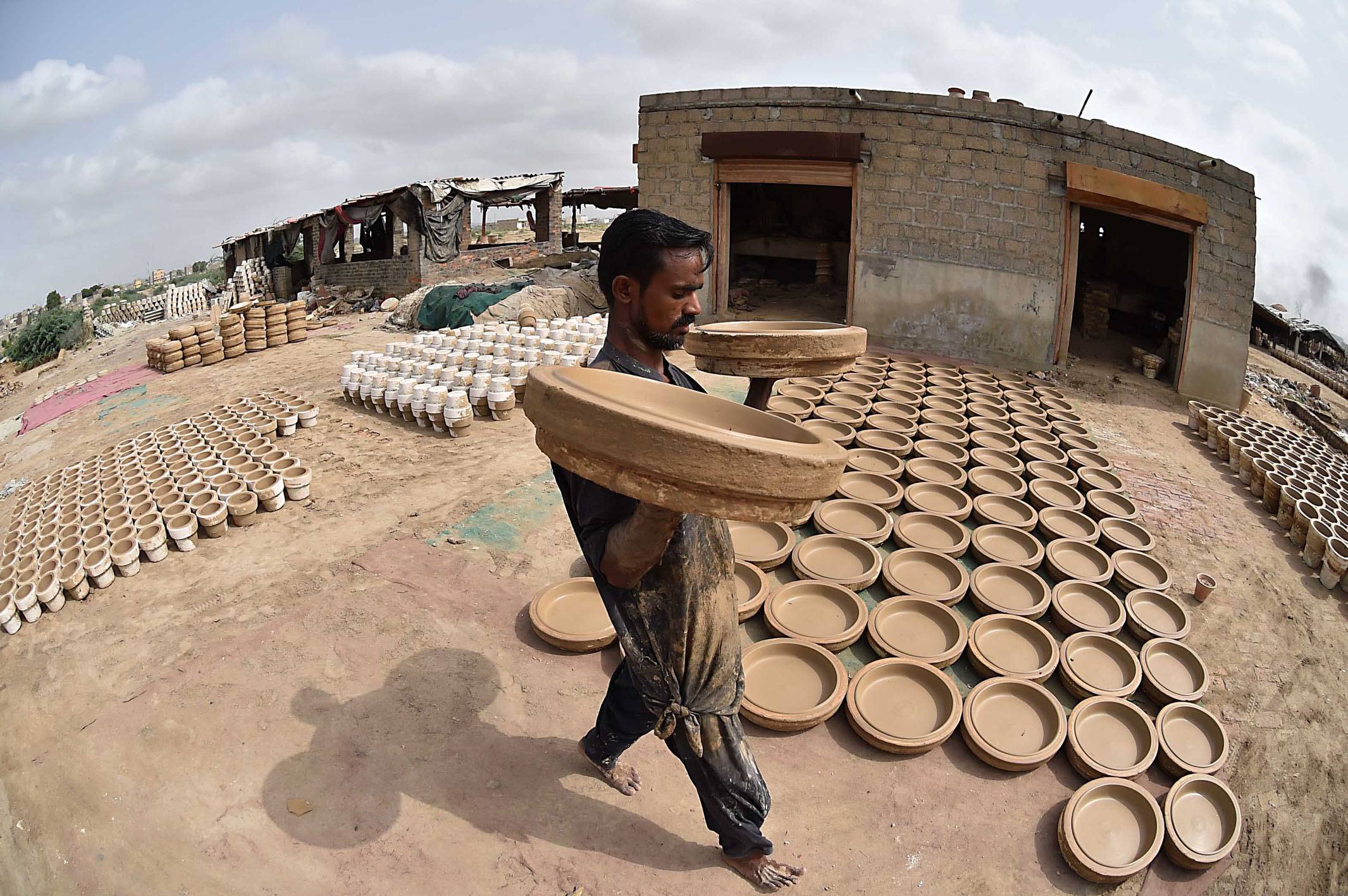 7月13日,工人在巴基斯坦卡拉奇郊区的一处陶艺工坊工作。手工陶器用料天然、价格实惠,是巴基斯坦人广泛使用的家庭日常用品。