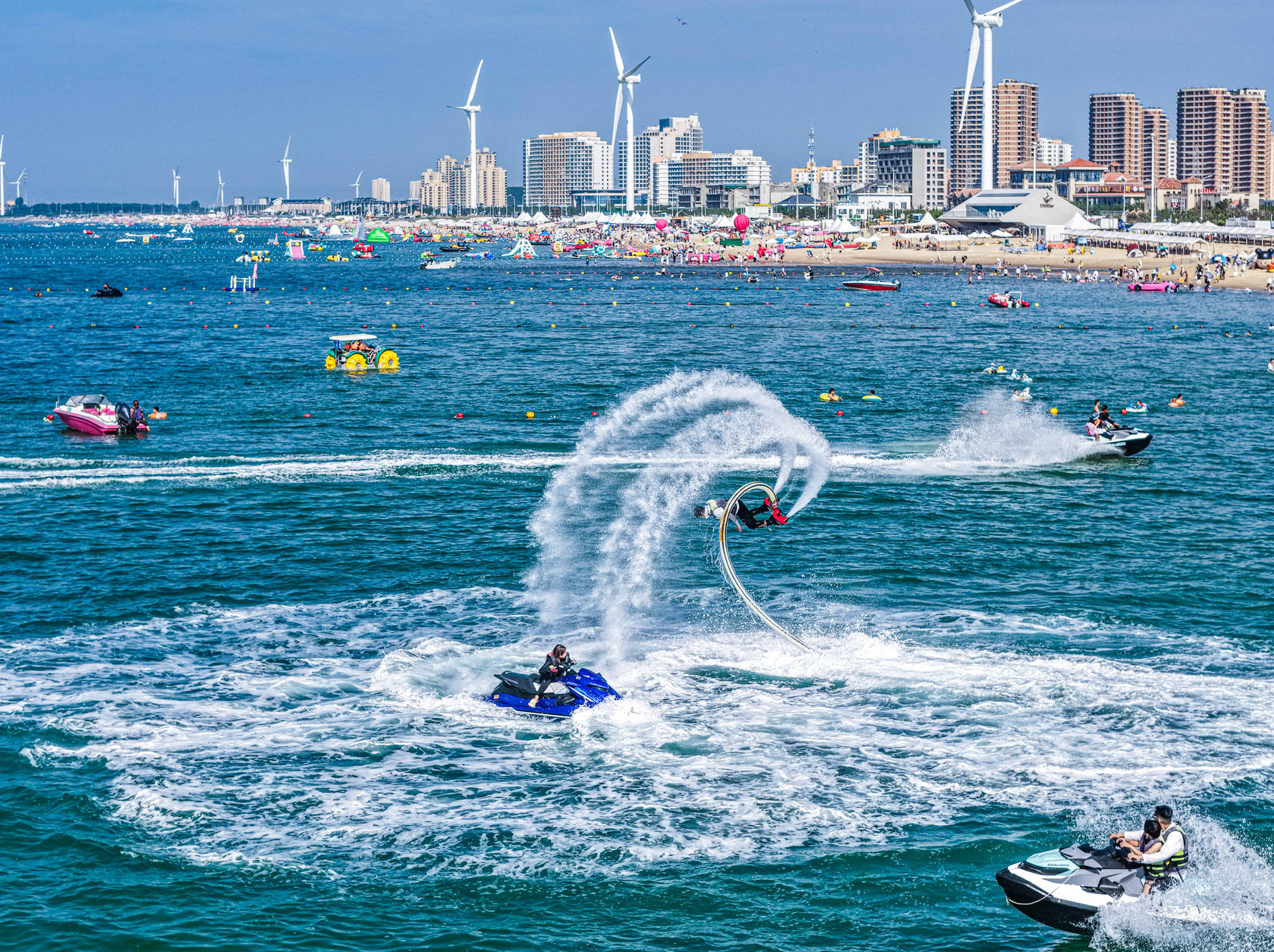眼下,我国多地持续高温,酷暑热浪催热“清凉经济”。图为在山东省荣成市那香海景区,游客享受海上旅游项目带来的清凉与欢乐(无人机照片)。