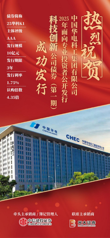 7月16日,中国华电科工集团有限公司(以下简称“华电科工”或“发行人”)在上交所成功簿记发行中国华电科工集团有限公司2025年面向专业投资者公开发行科技创新公司债券(第一期)(以下简称“本期债券”),实现了华电科工在上交所的首单亮相。本期科创债券为3年期固定利率品种,发行规模10亿元,票面利率1.75%,进一步优化了发行人的融资结构。