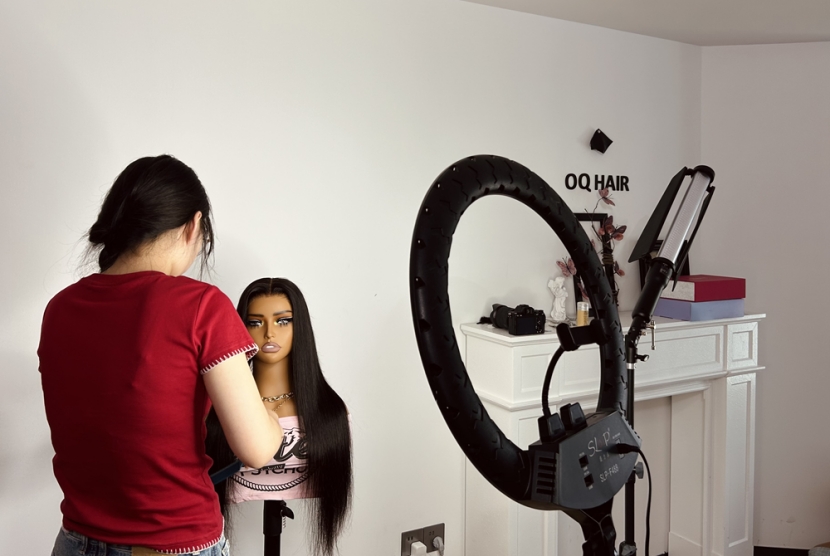(OQ Hair员工在调试假发)