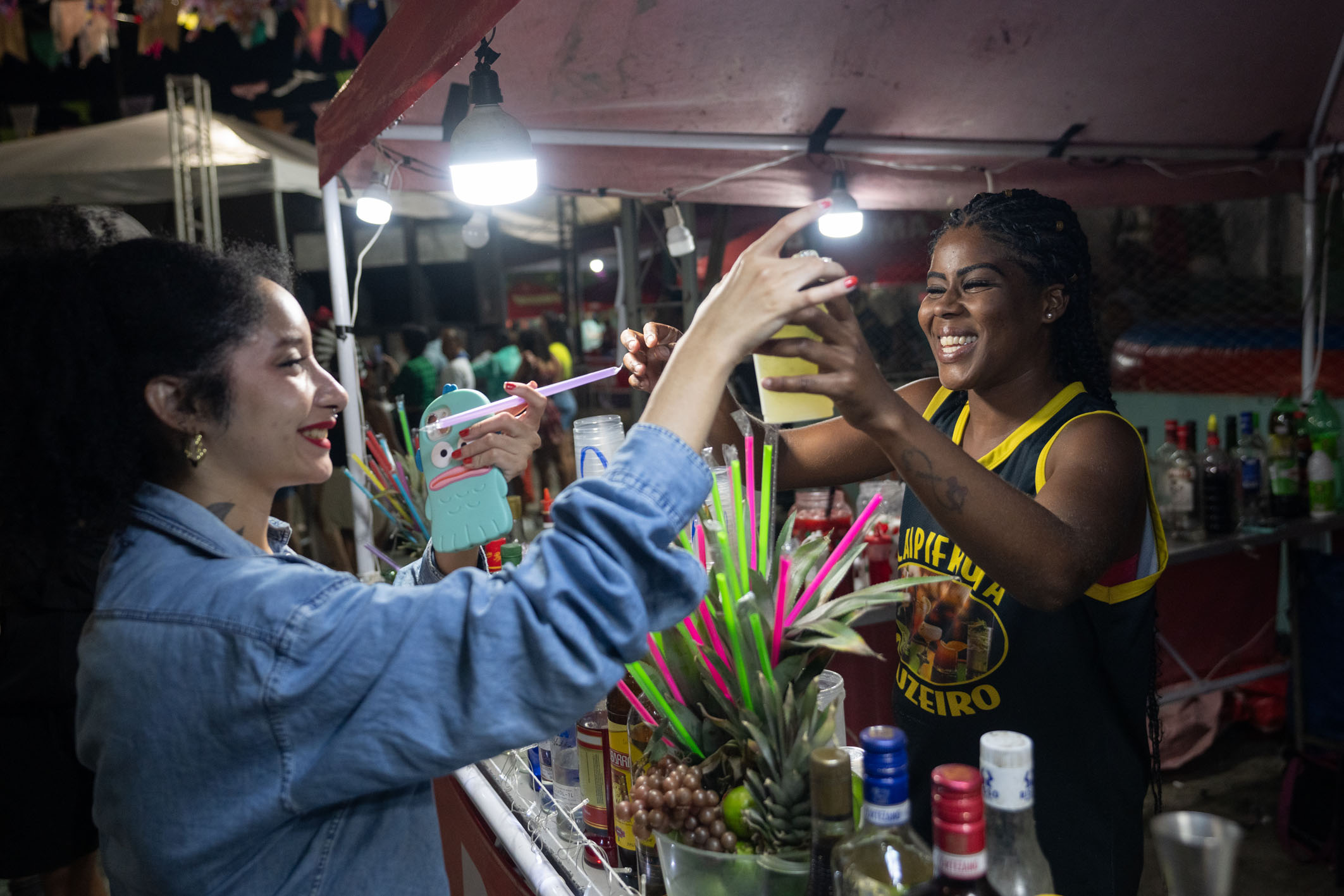 图为在巴西里约热内卢的曼吉尼奥斯社区,顾客在“丰收节”活动的一处摊位上购买饮品。