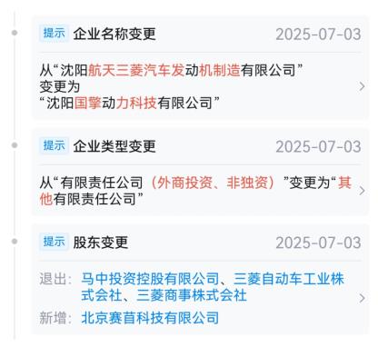 值得注意的是,三菱汽车的退出早有预兆。天眼查数据显示,今年7月初,沈阳航天三菱已完成更名为沈阳国擎动力科技有限公司。同时,三菱汽车已退出股东名单,北京赛苜科技有限公司成为新股东,持有该公司49%的股权。