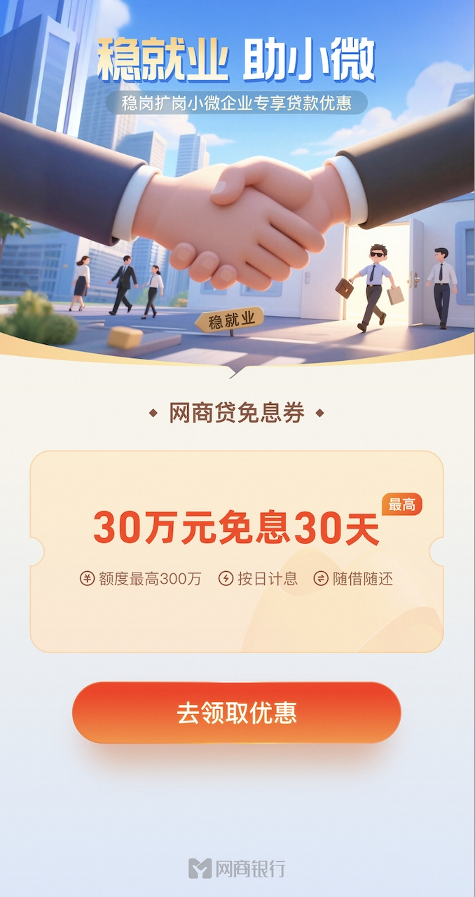 近日,网商银行推出“稳岗扩岗专享贷款”服务,小微企业、小微企业主与个体工商户来申请贷款时,在提供最高额度300万纯信用贷款的基础上,额外给予专项贷款免息权益,如30万元免息30天、30万元免息10天等,切实降低经营主体融资成本,助力他们增强扩经营、招人手的信心。