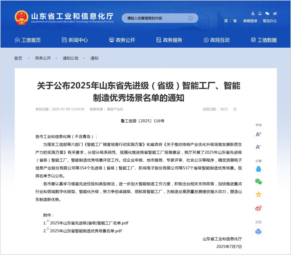 山东省工业和信息化厅《关于公布2025年山东省先进级(省级)智能工厂、智能制造优秀场景名单的通知》 山东省工业和信息化厅网站截图
