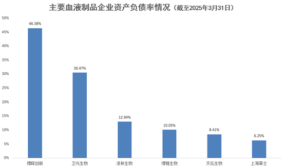 Wind数据显示,截至2025年3月末,在“SW血液制品板块”中,卫光生物的资产负债率远高于行业平均值的19.08%,而行业龙头企业天坛生物和上海莱士的资产负债率均低于10%,分别仅为8.41%和6.25%。