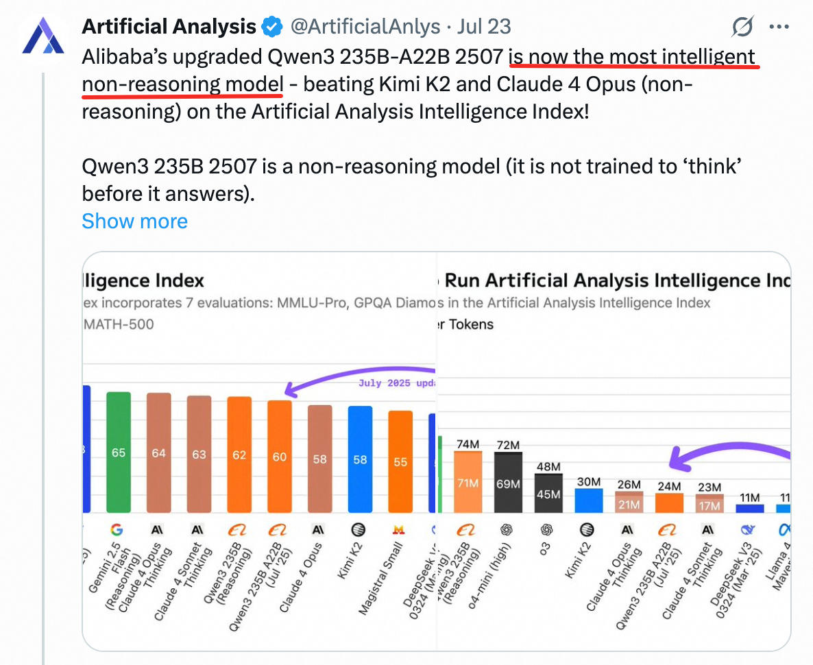 3天前开源的Qwen3-235B-A22B-Instruct-2507(非思考版)新模型,性能显著提升,在GPQA(知识)、AIME25(数学)、LiveCodeBench(编程)、Arena-Hard(人类偏好对齐)、BFCL(Agent能力)等众多测评中表现出色,超越Claude4(Non-thinking)等领先闭源模型。权威AI研究机构Artificial Analysis指出,“千问3是全球最智能的非思考基础模型”。