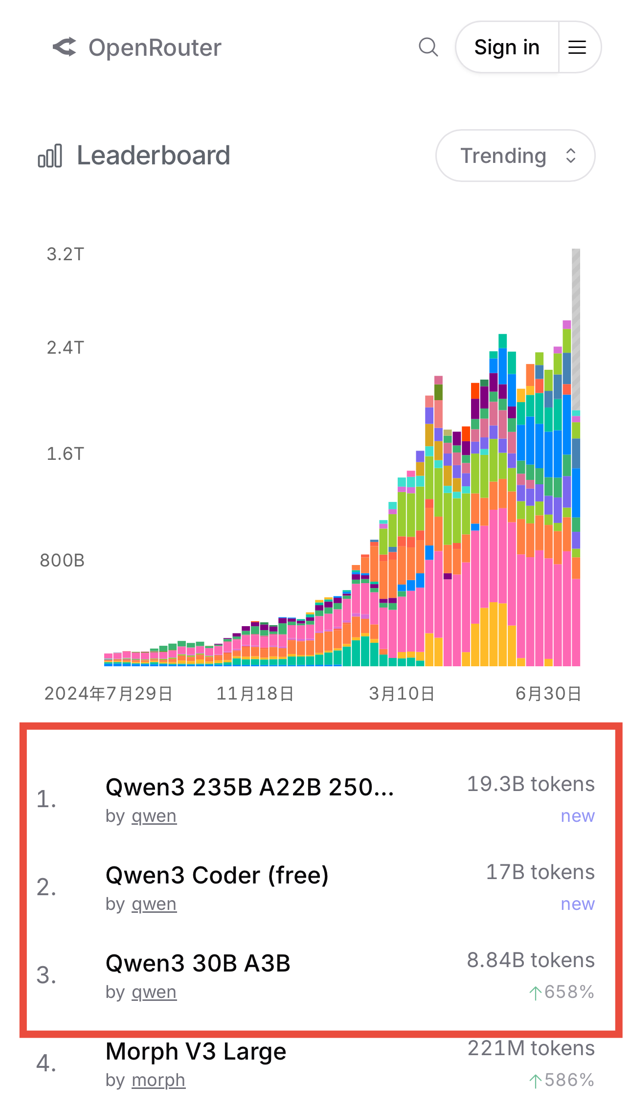 Qwen3-Coder的开源,引发硅谷科技圈关注,在全球AI圈掀起一波“AI编程”热潮。推特创始人杰克·多尔西(Jack Dorsey)、爆火Agent应用Perplexity CEO 阿拉温德·斯里尼瓦斯(Aravind Srinivas)、著名风投公司a16z合伙人马克·马斯克罗(Marco Mascorro)等硅谷大咖盛赞Qwen3-Coder,HuggingFace CEO 克莱门特·德朗格(Clement Delangue)更是连转带发12条推文,向全球开发者力荐这一最好的编程模型。海外知名模型API聚合平台OpenRouter数据显示,阿里千问API调用量暴涨,过去几天已突破1000亿Tokens,在OpenRouter趋势榜上包揽全球前三,是当下最热门的模型之一。