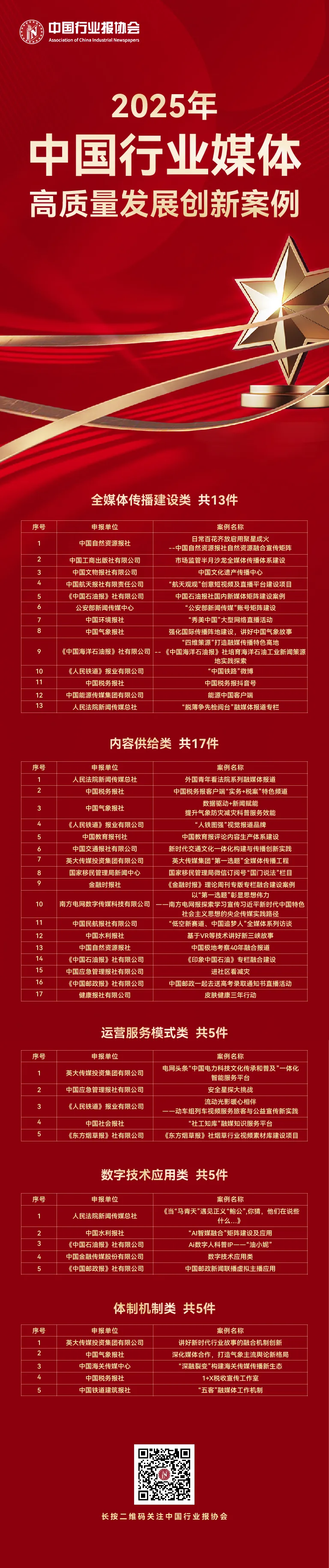 中国行业报协会主办的2025年中国行业媒体高质量发展创新案例征集活动结果于7月26日正式揭晓。通过多维度全渠道的广泛征集,经过专家评委推选、商定,5大类共认定出45件获选案例。