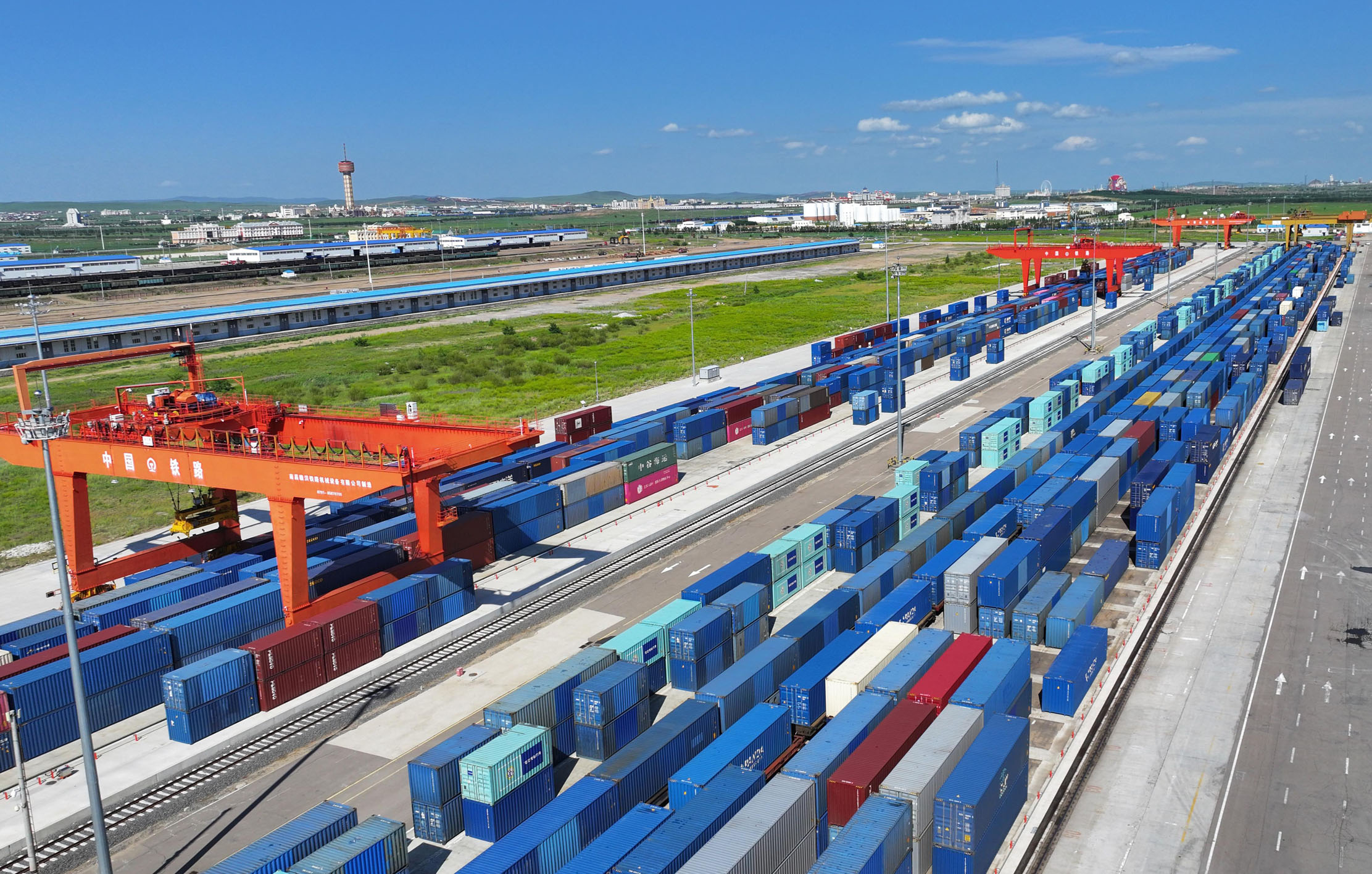 7月24日,回程中欧班列在中国铁路哈尔滨局集团有限公司满洲里站集装箱换装场内进行换装作业。自2013年开行中欧班列以来,至今累计通行量已突破30000列,发送货物近300万标箱,中欧班列通行量约占全国开行总量的三成。