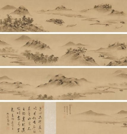 《画法大成》虽载有朱颐厓31幅山水版画,但画谱的程式化印刷无法传递笔墨神韵。此手卷展现的泼墨技法、空间诗意与“移步换景”效果虽然可以互相印证,但在版画中根本无法呈现。由于版画典籍与水墨实践的割裂,因此仅通过《画法大成》无法对朱颐厓的书画艺术有长足清晰的认知。