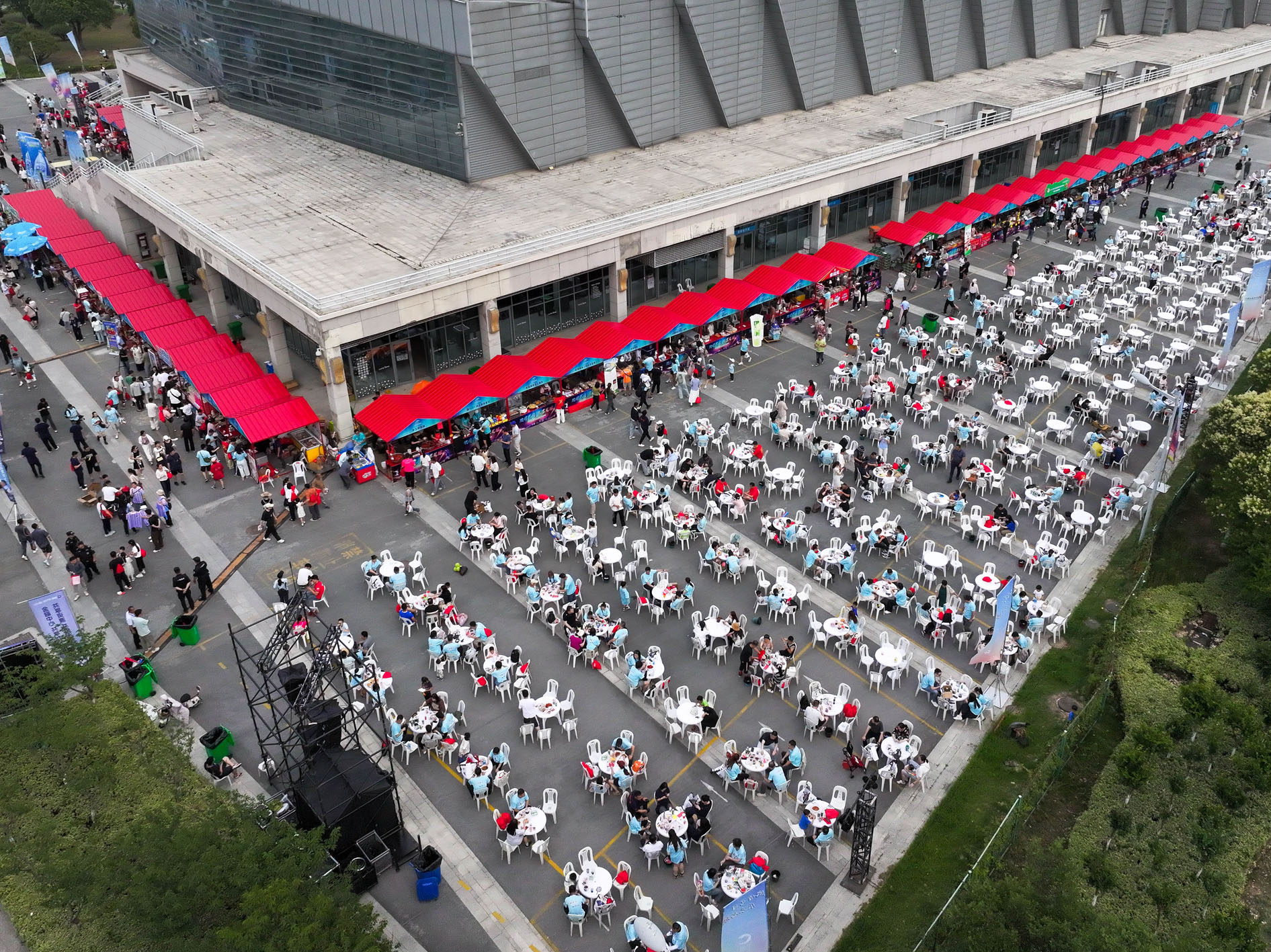 图为江苏淮安“苏超”市集(无人机照片)。 新华社记者 李博 摄