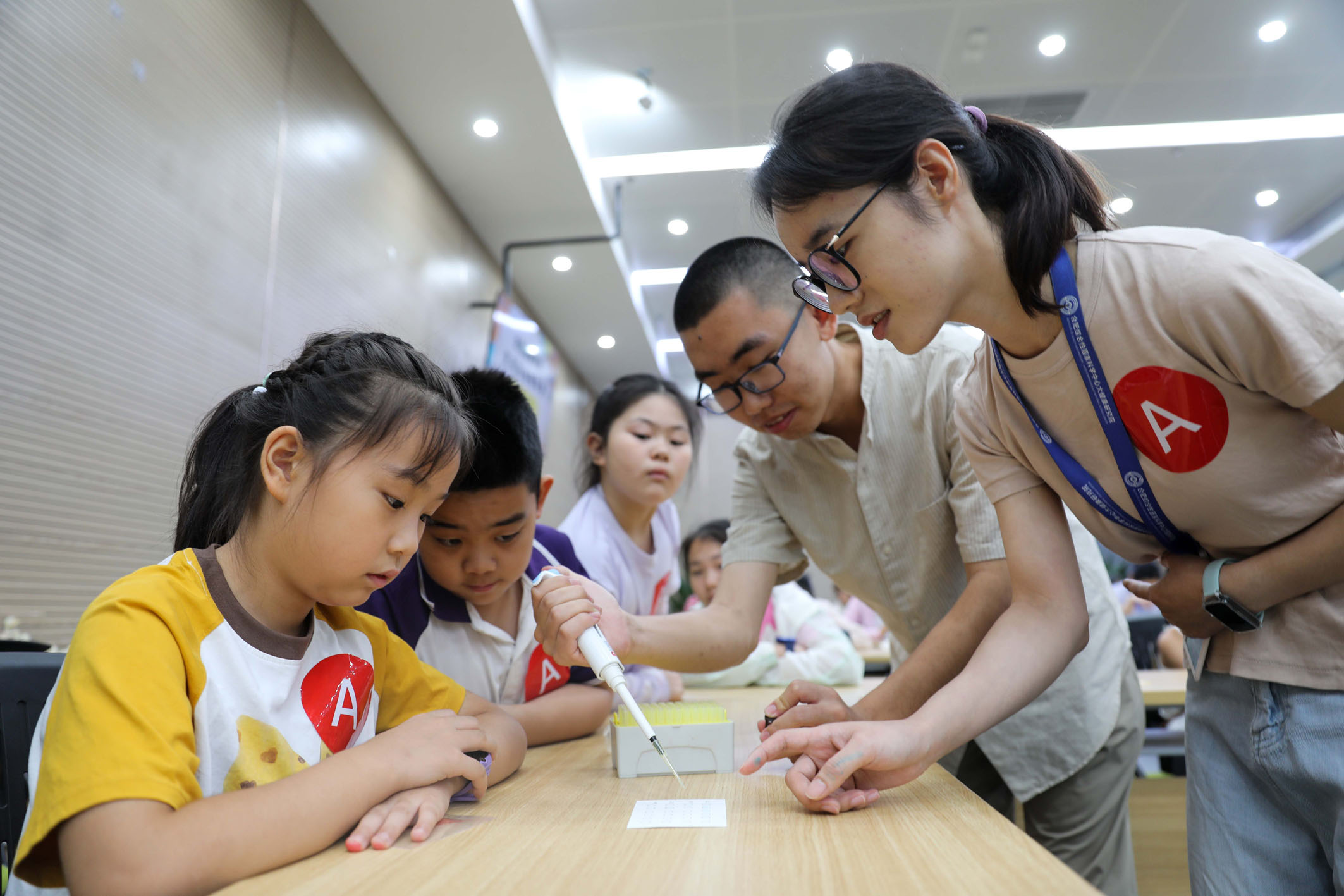 7月25日,安徽合肥综合性国家科学中心大健康研究院开展“生物科普研学营”活动,让孩子们在探索学习中感受生物科技的魅力。图为合肥综合性国家科学中心大健康研究院工作人员正辅导孩子们将吸取的显色液滴加到试纸上。