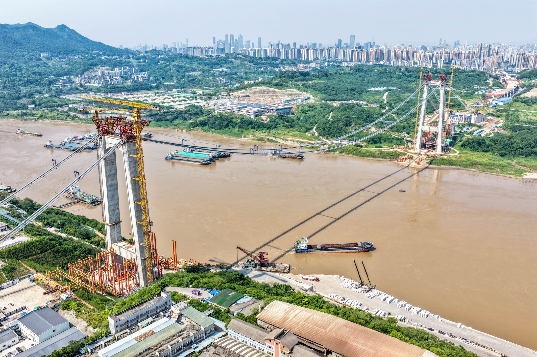 这是7月30日拍摄的重庆黄桷沱长江大桥主缆架设作业现场(无人机照片)。当日,由重庆城投集团投资、城投建设公司组织建设、中国铁建大桥局承建的黄桷沱长江大桥顺利完成主缆架设工作,标志着大桥建设即将进入钢桁梁吊装工序。