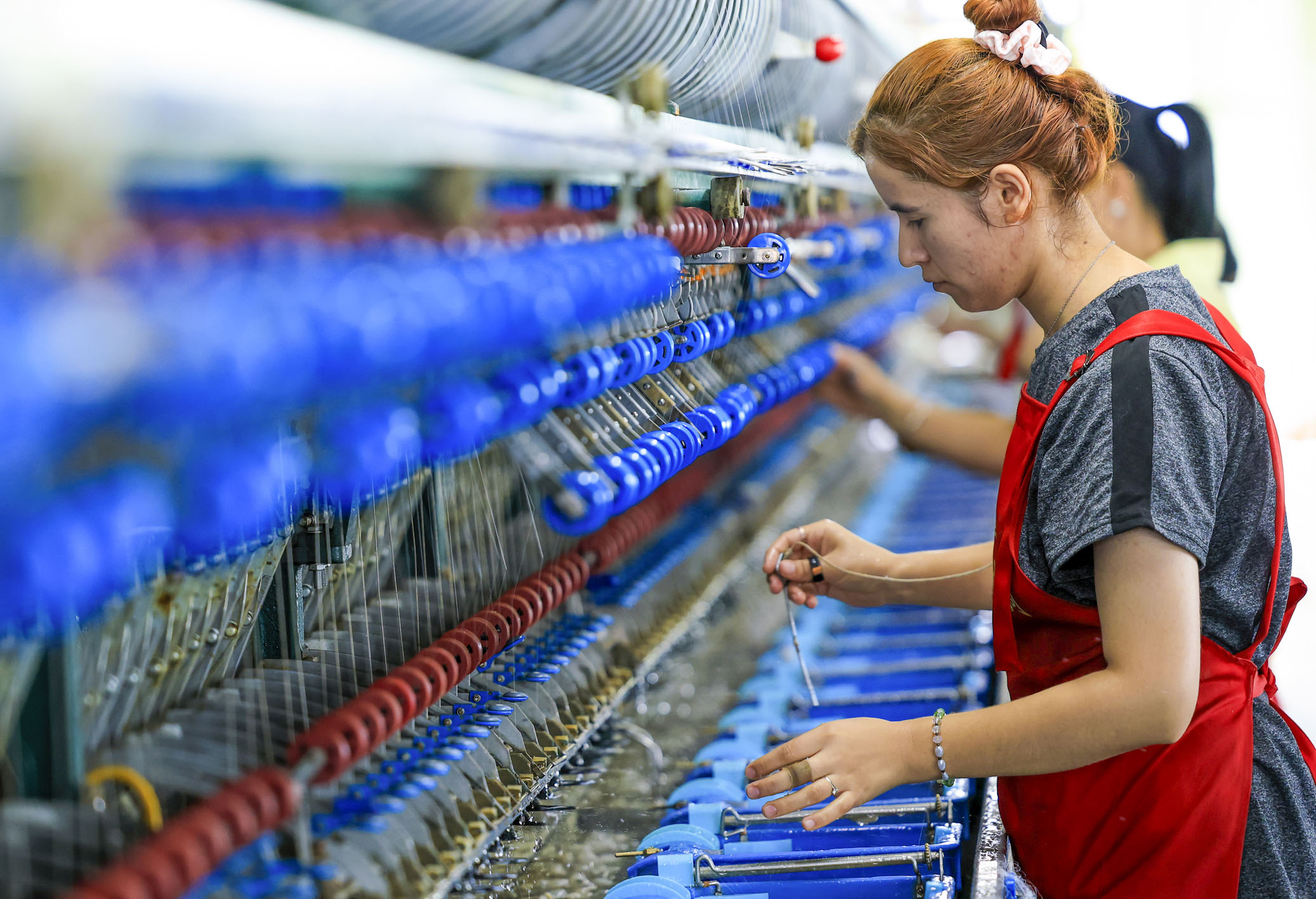 7月29日,工人在新疆丝锦丝绸纺织有限公司生产车间内的自动缫丝机上查看丝线。近年来,新疆塔城地区乌苏市引进桑蚕茧丝绸智能化全产业链项目,鼓励农民种桑养蚕,拓宽乡村振兴新“丝”路。该项目集种桑、养蚕、缫丝、织绸、销售为一体,为当地优化农业种植结构,助力农民增收致富、推动乡村振兴提供动力。