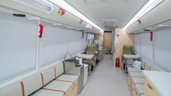 车辆采用多功能空间设计,充分体现了人性化的设计理念。驾驶区配备智能辅助系统,减轻驾驶员疲劳;等候区设有长条沙发、饮水机、洗手池等设施,为患者提供舒适环境;诊疗区配备血液细胞分析仪,可进行初步检查与抽血;检验区配备多功能检查床和化验桌,支持彩色多普勒超声、12导联心电图等检查;车辆尾部还设有休息区,方便医护人员换衣与储存物品。