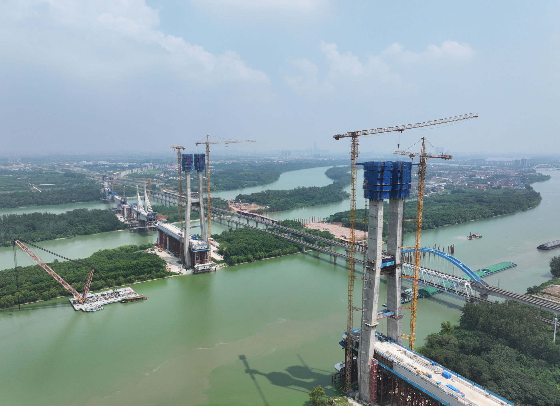 这是8月5日拍摄的沪渝蓉高铁跨京杭运河斜拉桥建设现场(无人机照片)。当日,由中国铁建大桥局承建的沪渝蓉高铁跨京杭运河斜拉桥主塔顺利封顶。至此,大桥核心支撑结构施工圆满收官,项目全面转入钢梁及斜拉索安装新阶段。该桥位于江苏扬州境内,是沪渝蓉高铁全线关键控制性工程,桥长564.3米,主跨300米。沪渝蓉高铁是国家“八纵八横”高铁骨干通道之一,线路总长约2100公里,设计时速350公里。