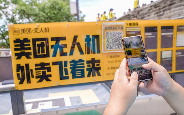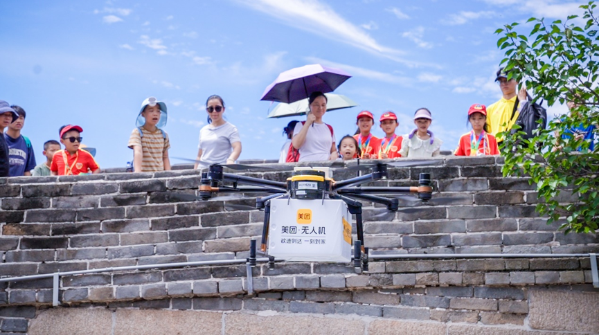 美团无人机在八达岭长城配送外卖。