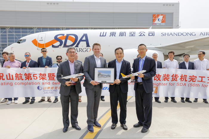 8月8日,山东航空与波音公司在山东太古飞机工程有限公司(STAECO)举办波音737-800客改货交付仪式,共同庆祝第五架737-800波音改装货机(737-800BCF)顺利交付。