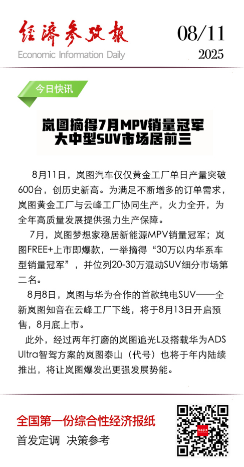 7月,岚图梦想家稳居新能源MPV销量冠军;岚图FREE+上市即爆款,一举摘得“30万以内华系车型销量冠军”,并位列20-30万混动SUV细分市场第二名。